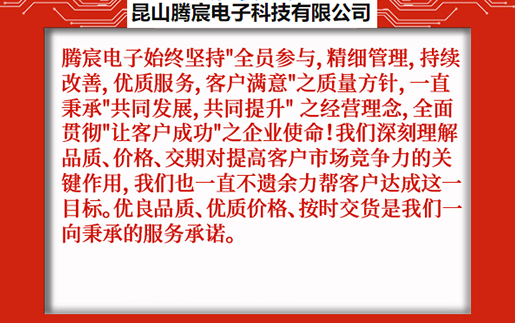 昆山騰宸電子科技有限公司位于中國線路板加工之都昆山千燈,公司專注于電路板研發(fā)設(shè)計、PCB抄板、元器件采購、SMT貼片加工、組裝測試,為客戶提供一站式電子制造服務(wù)。騰宸電子始終堅持"全員參與,精細管理,持續(xù)改善,優(yōu)質(zhì)服務(wù),客戶滿意"之質(zhì)量方針,一直秉承"共同發(fā)展,共同提升" 之經(jīng)營理念,全面貫徹"讓客戶成功"之企業(yè)使命!我們深刻理解品質(zhì)、價格、交期對提高客戶市場競爭力的關(guān)鍵作用,我們也一直不遺余力幫客戶達成這一目標。優(yōu)良品質(zhì)、優(yōu)質(zhì)價格、按時交貨是我們一向秉承的服務(wù)承諾。 ...